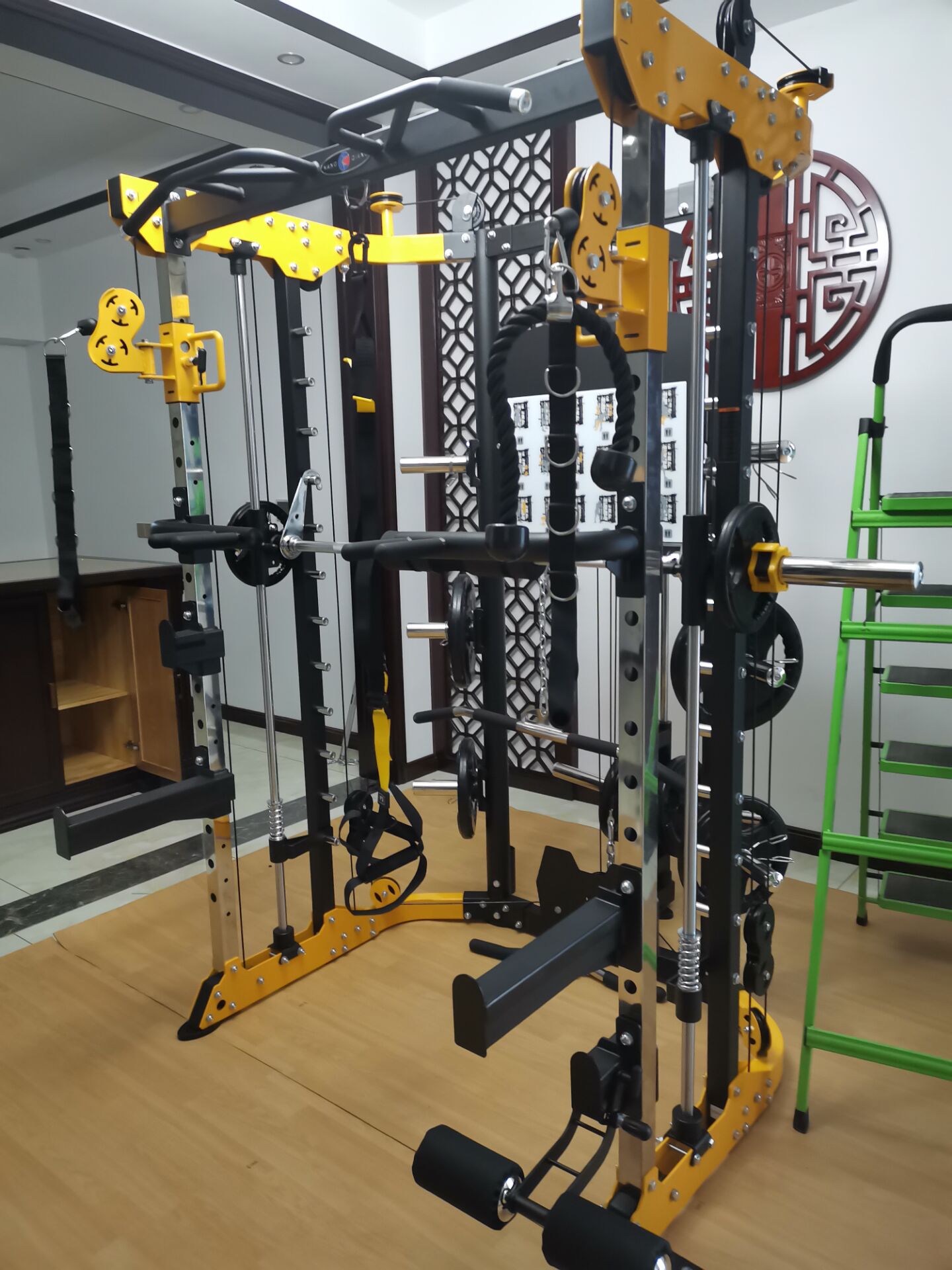 史密斯综合训练器参数有哪些,怎么选择?今天这里介绍一款综合训练器,康强BK509。净重339公斤,配重块60kg*2,占地面积2.97?,6mm钢绳索,管材规格:主架:50*50*2.5mm,大圆管?80mm,钢板框架5mm厚,内壁酸洗磷化,双层经典吸附两次高温烤漆,产品尺寸:2009*2238*1477mm。主要功能:飞鸟/站立高位下压,坐式高位下拉,杠铃杆左右转体及上推,单双杠,杠铃杆站立提拉,杠铃杆肩扛蹲起,拳击训练,俯卧撑,引体向上,配合训练凳可做坐姿勾腿,仰卧勾腿,上斜/下斜/平卧推举、坐姿勾腿等功能。其材料到做工,结实耐用,训练内容能做几十种。